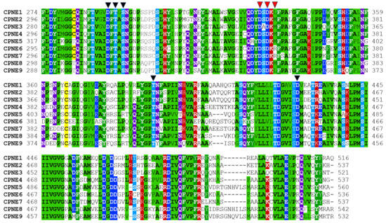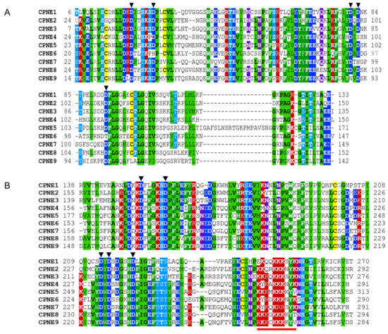 Tandem C2 domains in Copines belong to the type II class of C2 domains also present in PLC, rabphilin 3A, and other proteins [34]. C2A and C2B domains are connected by short linker sequences of 3–6 amino acids. Both C2 domains in Copines contain highly conserved aspartate residues involved in coordinating two or three calcium ions. Calcium binds to C2 domains with low micromolar affinity (within approximately 1–10 μM range) inducing interaction with negatively charged phospholipids such as phosphatidylserine [35]. The C-terminal part of C2B domains contains an unusual cluster of positively charged lysines and arginines that may potentially serve as a nuclear localization signal. In Copines, C2 domains are thought to mediate transient calcium-dependent association with the plasma membrane. In addition, Copines associate transiently or constitutively with various intracellular organelles, such as Golgi apparatus, clathrin-coated vesicles, and vacuole-like structures [36,37]. The membrane translocation of Copines was observed in multiple systems with the C2B domain playing the dominant role [7,32,33,36,38]. In addition to the ability to bind membranes, C2 domains in Copines are involved in calcium-dependent and calcium-independent protein–protein interactions [31,33,39,40,41]. C2B domains are connected to VWA domains by conserved linkers containing 12–13 amino acids that are likely essential for the correct structural assembly of Copines. Sequences of Human Copine C2A and C2B domains are illustrated in Figure 3.