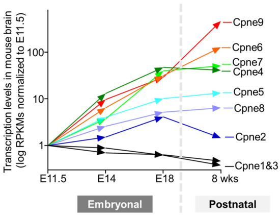 All nine Copine genes are expressed in the mammalian brain according to transcriptomics measurements and many were also detected at the protein level (Human protein atlas. Available online: https://www.proteinatlas.org/search/copine (accessed 5 December 2023)) [59]. Remarkably, Copines display highly varied distribution ranging from the ubiquitous expression at similar levels in all brain regions and cell types to the significant enrichment in specific types of neurons and glial cells. For example, Copine 1 is expressed in all neurons and glial cells at similar levels, while Copines 3 and 4 are highly expressed in Schwann cells and excitatory neurons, respectively. Such variability in Copine expression patterns likely reflects the diverse roles of Copine genes from housekeeping in all cells to specialized functions in distinct cell types. Developmental profiling of Copine expression in mouse brains during embryonal and postnatal stages reveals striking differences for the nine Copine genes (Mouse ENCODE transcriptome data. Available online: https://www.ncbi.nlm.nih.gov/bioproject/PRJNA66167/ (accessed 12 December 2023)) [60], summarized in (Figure 5).