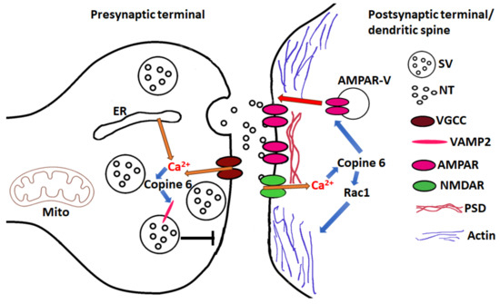 Pre- and postsynaptic functions of neuronal Copine 6. At the presynaptic terminal, Copine 6 binds synaptic vesicle (SV) SNARE protein VAMP2 and downregulates spontaneous neurotransmission. Calcium is released through voltage-gated calcium channels (VGCC) or from internal stores, such as endoplasmic reticulum (ER) or mitochondria (Mito). At the postsynaptic terminal or dendritic spine, Copine 6 recruits Rac1 to the plasma membrane in the presence of calcium and initiates remodeling of actin cytoskeleton followed by changes in spine morphology. Copine 6 also interacts with glutamate receptors, AMPA type (AMPAR), and facilitates AMPAR delivery to the plasma membrane by calcium-regulated exocytosis of AMPAR transport vesicles (AMPAR-V). For both functions, calcium comes through activated glutamate receptors NMDA type (NMDAR). NT denotes ‘neurotransmitter’; PSD—‘postsynaptic density’.