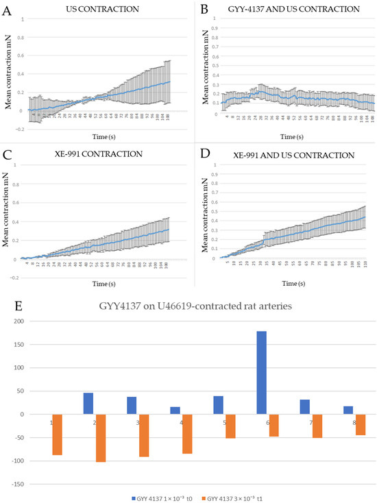 Baseline contractions (A–D), n = 3 (for each graph): (A). Ultrasound (US) does not significantly change the function of normalized pulmonary arteries. (B). After GYY 4137 precontraction, additional insonation causes no discernable effect. (C). XE-991 does not cause vascular contraction in resting pulmonary arteries. (D). XE-991 and US do not cause vascular contraction in normalized pulmonary arteries. (E). Adding GYY 4137 to rat lung U46619-contracted rat arteries (n = 7) elicits a biphasic response. Mean 45.8 (SD 55.5) at t0 (which lasts for about 1 min after adding GYY 4137) and a relaxation −70.0 % (SD 23.4) from t1 to later time points.