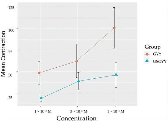 GYY 4137 induced vascular contraction interacting with increasing concentrations of tadalafil insonation (UTGYY) vs. control (TGYY). Two-way (class factors: groups and concentration) analysis of variance (ANOVA): F (10) = [2.96, 5.37], p = [0.1161, 0.0260], n = 6 per group. The graphs represent the vascular response to increasing concentrations of tadalafil in vessels contracted with GYY 4137 (1 × 10−4 M). These concentrations are used for exploratory purposes and are above therapeutic concentrations. Data are represented as mean and S.E.M.