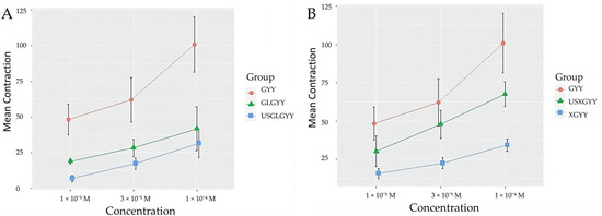 Average contractions induced by GYY 4137 in the absence and the presence of the potassium channel blockers, glibenclamide and XE991. (A)—Average GYY 4137 contraction in the absence (GYY) and the presence of a blocker of ATP-sensitive potassium channels, glibenclamide (GLGYY) and glibenclamide plus low-frequency ultrasound (USGLGYY) compared with each other with two-way (class factors: groups and concentration) analysis of variance (ANOVA): F (12) = [5.25, 7.77], p = [0.0231, 0.0069], n = 5 per group. (B)—GYY 4137 induced vascular contraction in the absence (GYY) and the presence of a blocker of KV7 channels, XE-991 incubation (XGYY) and XE991 plus low-frequency ultrasound (USXGYY), compared with each other with two-way (class factors: groups and concentration) analysis of variance (ANOVA): F (12) = [3.73, 21.93], p = [0.0550, <0.0001], n = 5 per group. The graphs represent the vascular response to increasing concentrations of GYY4137. Data are represented as mean ± S.E.M.