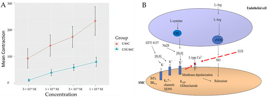 We incubated pulmonary arteries with GYY 4137 to test whether it could cause vascular contraction and attempted to modulate this effect with LUS. We tested Ca2+ signaling in human pulmonary vessels by contracting the vessels with U46619 (a thromboxane A2 mimetic that binds to specific G-protein-coupled receptors (TP receptors) [22] in Ca2+ free PSS, constructed a CaCl2 contraction dose–response curve, and modulated this effect with LUS [18]. We tested the phosphodiesterase type 5 (PDE5) inhibition effect on H2S signaling by incubating vessels in tadalafil (1 µmol) and that of endothelin-1 by incubating in ambrisentan (1 µmol) [22,23] and modulate it with LUS. We also tested the involvement of potassium channels in the GYY 4137-induced pulmonary vascular contraction: we used glibenclamide to inhibit KATP channels [24] and the KV7.2/7.3 blocker XE-991 [25].