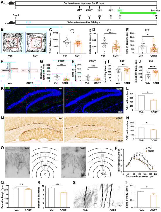 In order to evaluate the influence of prolonged corticosterone (CORT) administration on mice hippocampus and behaviors, mice were exposed to CORT for 36 days (Figure 1A). The total distance traveled in the open field arena was comparable between the two groups of mice (Figure 1B,C), indicating that locomotor activity was not impaired by CORT treatment. CORT-treated mice exhibited reduced activity and decreased time spent exploring the center of the open field (Figure 1D,E) or the open arm of the elevated plus maze (Figure 1F–H), indicating an anxiety-like state of mice. Moreover, the CORT-treated mice showed a depression-like condition as measured by increased immobility in FST and TST (Figure 1I,J). The hippocampus is well known as the principal target of GCs in the brain since it contains the greatest concentration of GC receptors, and animal studies reported that chronic exposure to CORT can cause damage to the hippocampus [7,10]. Therefore, hippocampal histological analysis was conducted. The number of EdU-positive and doublecortin (DCX)-positive cells was significantly decreased in CORT-treated mice (Figure 1K–N), indicating that CORT treatment led to the reduced proliferation of neural stem cells and newborn immature neurons in the dentate gyrus (DG) of the hippocampus, respectively. Contrary to the initial belief that neuron loss predominantly contributes to hippocampal volume reduction, recent studies suggest that dendritic and synaptic alterations are more likely to be responsible for hippocampal shrinkage [20]. Therefore, we explored the morphology of dendritic spines: CORT treatment significantly reduced the complexity of dendritic branching (Figure 1O–R) and spine density (Figure 1S,T). Altogether, prolonged CORT treatment led to depressive- and anxiety-like behaviors in mice, accompanied by reduced hippocampal neurogenesis and dendritic atrophy.