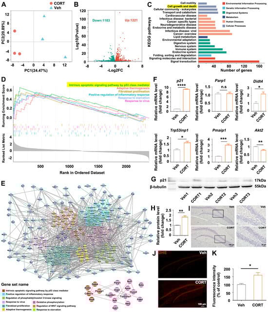 Identification of key pathways and hub genes contributing to CORT-induced abnormal hippocampal neurogenesis. (A) Principal component analysis (PCA) of the transcriptome of the hippocampus samples collected from the mice administrated CORT or vehicle. (B) Volcano plots of the DEGs for hippocampus of the 2 groups. The up-regulated DEGs are presented by red dots, and the down-regulated DEGs are presented by green dots. (C) The functional classification of the DEGs based on KEGG pathway analysis. (D) GSEA enrichment score curves of the top 6 GO pathways. The top panel shows the enrichment scores of each pathway. The middle vertical bars display the position of each gene. The bottom panel indicates the ranking metric scores. (E) Protein–protein interaction (PPI) network of the important genes. The grey lines indicated the associations between the genes. (F) The mRNA expression levels of p21 and the oxidative stress-associated genes. Western blot analysis (G) and quantification (H) of p21 protein expression level. (I) Representative images of p21 immunostaining in hippocampus of mice. Representative images (J) and quantification (K) of DHE staining in hippocampus of mice. Data are presented as mean ± SEM, n = 3 per group, statistical comparisons were performed by Student’s t test. * p < 0.05, ** p < 0.01, *** p < 0.001, **** p < 0.0001, n.s.: no significance.