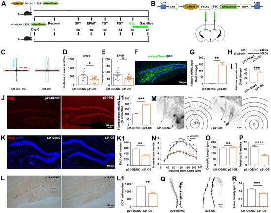 In order to validate the role of p21, we conducted a p21 overexpression (p21-OE) experiment by bilateral stereotaxic injection of recombinant AAV (rAAV) into the DG of mice (Figure 3A,B). Four weeks after the stereotactic surgery, the two groups of mice showed no statistical difference in total distance traveled in the open field arena (Supplementary Figure S1), indicating that locomotor activity was not influenced by p21-OE. Mice of the p21-OE group exhibited anxiety-like behaviors, as evidenced by a significant decrease in their tendency to explore the open arms (Figure 3C–E). Forty-three days after AAV injection, histological analysis showed the expression of mNeonGreen in DG area of mice, indicating that AAVs-mediated gene transfer can achieve efficient long-term expression in the hippocampus (Figure 3F). We validated the remarkable up-regulation of p21 expression in the hippocampus of the p21-OE group by qPCR (Figure 3G) and Western blotting (Figure 3H,I). p21-OE mice also showed ROS accumulation in the DG area (Figure 3J), similar to what we observed in CORT-treated mice (Figure 2J,K). The number of EdU-positive and DCX+ cells significantly decreased in p21-OE mice (Figure 3K,L), indicating reduced hippocampal neurogenesis due to p21 overexpression. Moreover, p21-OE mice showed reduced complexity of dendritic branching (Figure 3M–P) and spine density of granule neurons (Figure 3Q,R). This result suggested that p21-overexpression in hippocampus almost recapitulated CORT-induced behavior deficits and histological alterations.