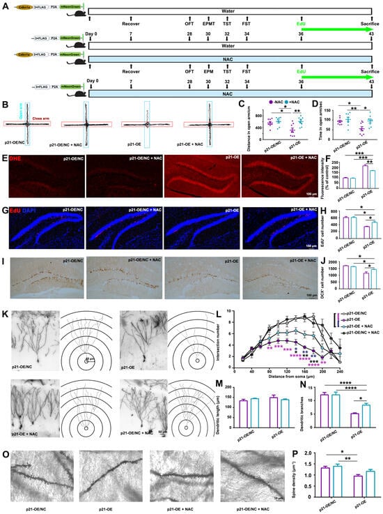 Elevated ROS is considered to cause sustained suppression of hippocampal neurogenesis [21], and we also identified that p21 overexpression led to ROS accumulation (Figure 3J) and reduced hippocampal neurogenesis in the DG area (Figure 3K,L). This prompted us to speculate whether inhibition of ROS could prevent p21-OE-induced hippocampal alterations and behavioral deficits. P21 overexpression was conducted by bilateral stereotaxic injection of AAV-Cdkn1a-3×Flag-mNeonGreen, while antioxidant N-acetyl cysteine (NAC) was treated to mice in drinking water to scavenge ROS (Figure 4A). NAC treatment inhibited p21-OE-induced anxiety-like behaviors (Figure 4B–D). Histological analysis confirmed that antioxidant NAC treatment partly inhibited p21-OE-mediated ROS production (Figure 4E,F) and attenuated p21-OE-induced hippocampal alterations, including the reduction in hippocampal neurogenesis (Figure 4G–J) and dendritic atrophy (Figure 4K–P). This result suggested that p21 overexpression directly induced ROS accumulation in the hippocampus, thus leading to hippocampal histological alterations and associated behavioral deficits.