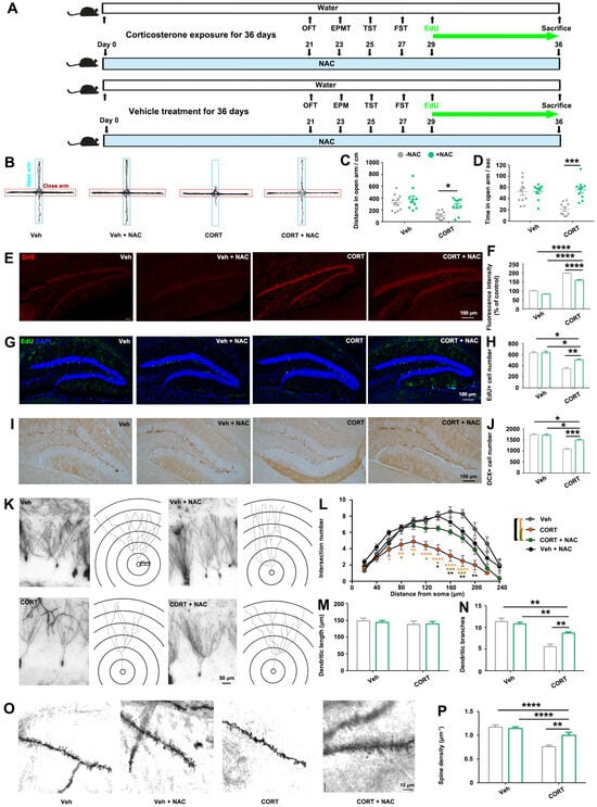 Antioxidant treatment partially rescued CORT-induced phenotypes. (A) Study design. (B) Representative trajectory diagrams of the mice in the elevated plus maze test. Distance traveled (C) and time spent (D) in the open arm by mice. Representative images (E) and quantification (F) of DHE staining within the DG area. Representative images (G) and quantification (H) of EdU staining within the DG area. Representative images (I) and quantification (J) of DCX staining within the DG area. (K) Representative images and tracings of the granule cell in DG area. Quantification of intersection number (L), dendritic length (M) and branch number (N) of granule cells. (O) Representative images of dendritic spines of granule cells in DG area. (P) Quantitative analysis of spine density of the granular cell dendrites. Data are presented as mean ± SEM, n = 12 per group for behavior tests; otherwise, n = 3 per group. Statistical comparisons were performed by one-way ANOVA. * p < 0.05, ** p < 0.01, *** p < 0.001, **** p < 0.0001, n.s.: no significance. EPMT, elevated plus maze test.