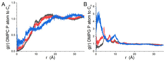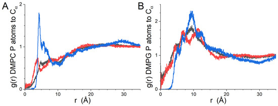 (A) Lateral RDFs from the GP412 simulation results between DMPC P atoms in the leaflet of the bilayer to which the peptides are bound and gp41rk hydrophobic residues (black), polar residues (red) and positive residues (blue). (B) Lateral RDFs from the GP412 simulation results between DMPG P atoms in the leaflet of the bilayer to which the peptides are bound and gp41rk hydrophobic residues (black), polar residues (red) and positive residues (blue).