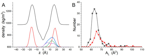 Transbilayer density profiles calculated from the GP410 simulation results (A). The profile for the entire system is black, while the profile calculated from the phosphate groups is red. The phosphate group density profile has a constant baseline of 600 kg/m3 added to it for presentation purposes. (B) Histograms of the time-averaged for DMPC (black) and DMPG (red).