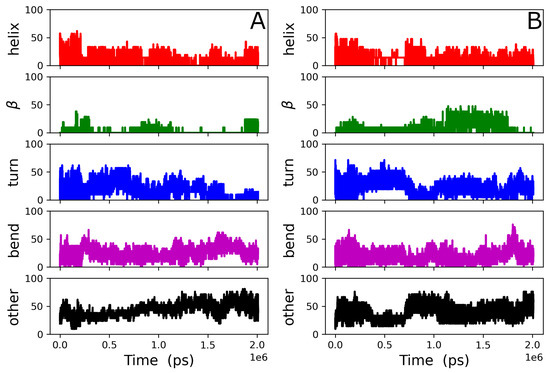 Secondary structure percentages of (A) gp41rk 1, (B) gp41rk 2, (C) gp41rk 3 and (D) gp41rk 4 during the GP414 simulation, including the short NPT equilibration run (see Section 2.3), that were determined as described in Section 2.4.