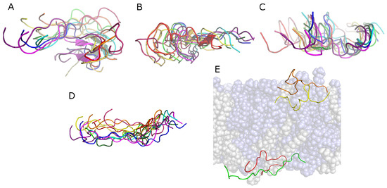 As can be seen in the results of the mindist analysis [26] presented in Figure S3, both peptides associated with the bilayer very soon after the simulation began. The peptides did not spend a great deal of time in contact with each other based on the peptide–peptide mindist analysis [26], which is presented in Figure S4. The secondary structures of both peptides contained a considerable fraction of -helix, as can be seen in Figure 6A,B, in contrast to the single peptide in the GP411 simulation. There is essentially no -sheet structure present in the secondary structures of either peptide. The secondary structures of the two peptides are similar in the final 200 ns of the simulation. Neither peptide structure is static over the course of the simulation, much like the peptide in the GP411 simulation. Ensembles of example structures for gp41rk 1 and gp41rk 2 are shown in Figure 6C,D. While the highly helical secondary structure of gp41rk 1 is relatively stable, it moves around more within the bilayer structure than gp41rk 2. The final structure in the GP412 simulation is show in Figure 6E and reveals how deeply the two peptides penetrated into the hydrocarbon core of the bilayer.