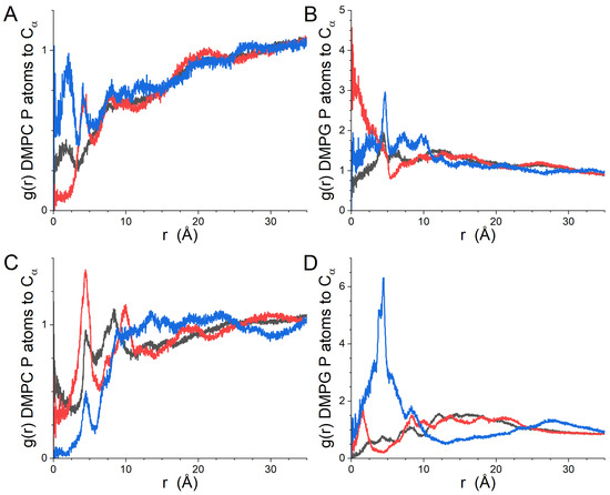 Lateral RDFs between the atoms of the gp41rk pairs bound to the leaflets of the bilayer and P atoms of the lipids in the same leaflet of the bilayer as the peptides: (A) gp41rk 1 and 4 pair to the DMPC P atoms; (B) gp41rk 1 and 4 pair to the DMPG P atoms; (C) gp41rk 2 and 3 pair to the DMPC P atoms; (D) gpr41rk 2 and 3 pair to the DMPG P atoms. In all four panels, the lateral RDFs for the gp41rk hydrophobic residues are black, those for the polar residues are red, and the blue curves are the lateral RDFs calculated for the positive residues.