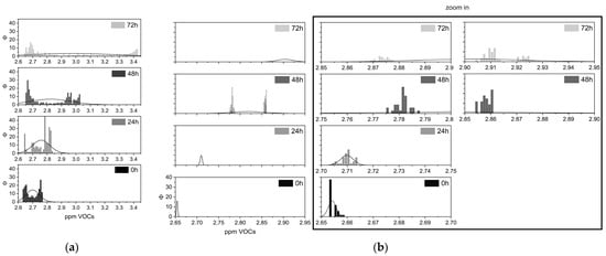 Volabolomic profiles of cells and tissues at 0, 24, 48, and 72 h after death are displayed by VOCs frequency in Figure 3. VOCs’ distributions exhibited comparable behavior at almost all of the four intervals. Interestingly, from 48 to 72 h, both distributions became dispersed.
