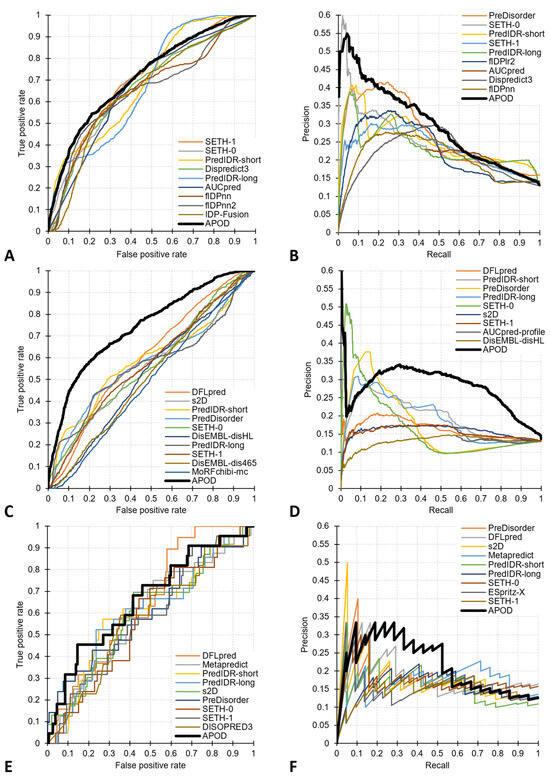 Figure 1. ROC curves and PR curves for the tests on the CAID2 test dataset with 348 proteins. Panels (A,B) focus on the assessment of the predictions of DL residues in sequences. Panels (C,D) are for the predictions of residues in DLs vs. other disordered residues. Panels (E,F) are for the prediction of the proteins harboring DLs. Each panel includes results for the top 10 methods for a given metric and dataset.