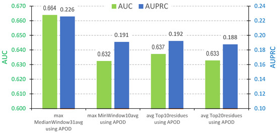 We use the residue-level predictions generated by each of the 37 predictors to generate protein-level scores that can be used to identify proteins harboring DLs. DLs range between 10 and 288 consecutive residues in length, with a median length of 31, in the test dataset. Correspondingly, we process the residue-level scores to identify segments of consecutive residues with high propensities. More precisely, we apply sliding windows of size 10 (minimal DL length) and 31 (median DL length) to scan the input sequences. We compute an average of the residue-level propensities in each window and select the highest of these averages as the protein-level score. This simulates identifying a DL region in the sequence, which by definition should be composed of consecutive residues that obtain high predicted propensities. Moreover, as an alternative, we compute an average of the predicted residue-level propensities for the 10 and 20 residues with the highest propensities. These two protein-level scores focus on the subset of residues with the highest scores, as they would be a proxy for the presence of DLs. We do not consider using the average for all residues in the sequence since DLs cover a relatively small fraction of the amino acids in the sequences. We empirically compare the four protein-level scores that we define above by applying them to the predictions of the 37 methods. We pick the most accurate of the 37 methods for each protein-level score, as measured using the AUC and AUPRC of the corresponding predictions. Results, which we summarize in Figure 2, reveal that APOD generates the best protein-level scores. This agrees with the relatively best predictive quality of this method in Table 1 and Table 2. Among the four protein-level scores, the approach based on the median size sliding window produces the best performance, with AUC of 0.664 and AUPRC of 0.226. This can be explained using the fact that this approach most closely mimics the underlying characteristics of DLs, including their size and segment-based nature.