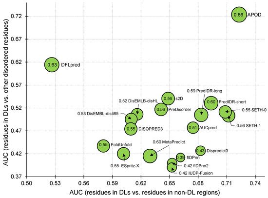 Figure 3. Predictive performance for the top ten methods that we identify using AUC scores in Table 1, Table 2 and Table 3. The x-axis shows the AUC when predicting residues in DLs vs. residues in non-DL regions (based on Table 1). The y-axis gives the AUC when predicting residues in DLs vs. other disordered residues (based on Table 2). The radius of the markers corresponds to the AUC for the predictions of proteins harboring DLs, which is listed inside the marker (based on Table 3). Methods are named next to their markers.