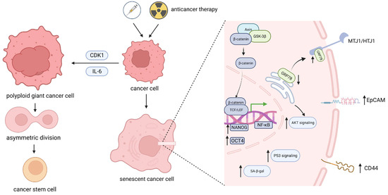 Figure 1. Stemness reprograming in senescent cancer cells. After undergoing anticancer therapy, a portion of tumor cells undergo senescence. These cells can be reprogrammed through increased expression or the corresponding transcriptional regulation of intracellular stem genes such as OCT4 and NANOG or cell surface stem-related markers such as EpCAM and CD44, subsequently affecting downstream signaling pathways. Alternatively, senescence-related CDK1 and IL-6 can induce the production of polyploid giant cancer cells and subsequently proceed via asymmetric division. Ultimately, senescent tumor cells acquire stemness characteristics. OCT4, POU domain, class 5, transcription 1; NANOG, Recombinant NANOG homeobox protein; EpCAM, Epithelial cell adhesion module; CDK1, Cyclin dependent kinase 1; GRP78, Glucose regulated protein 78; MTJ1/HTJ1, DnaJ (Hsp40) homolog subfamily C member 1.