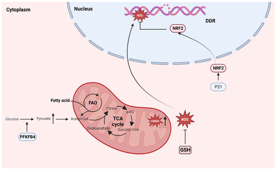 Figure 4. Common characteristics of senescence and cancer stem cell metabolism. Senescence cells produce excessive ROS, promoting genomic instability and exacerbating malignant transformation. In CSCs, p21 neutralizes excessive ROS by increasing NRF2 transcriptional activity and relies on FAO to minimize the impact of OXPHOS. PFKFB4, 6-phosphoFructo-2-kinase/Fructose-2,6-biphasase 4; FAO, Fatty acid oxidation; TCA, tricarboxylic acid cycle; A-KG, a-ketoglutaric acid; ROS, reactive oxygen species; mtROS, mitochondrial reactive oxygen species; DDR: DNA damage response; NRF2: NFE2 Like BZIP Transmission Factor 2; GSH, glutathione; OXPHOS, oxidative phosphorylation.