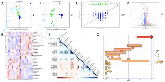 The untargeted metabolomics analysis (UTMs). (A) Principal component analysis (PCA) plots and (B) orthogonal projections to latent structures–discriminate analysis (OPLS-DA) score plots illustrate the clustering and dispersion of the two groups. (C) Permutation tests of OPLS-DA mode of metabolomics analysis. (D) The volcano plot represents the screening of differentially abundant metabolites, and the point size represents the variable importance projection (VIP) value of the OPLS-DA model. Upregulated metabolites are shown in red, downregulated metabolites in blue, and non-significantly different metabolites in gray. The hierarchical cluster analysis heatmap (E) of DEMs demonstrated in POAG and control group. A represents POAG, and B represents the control group. Red represents upregulation, while blue represents downregulation. Each column represents an individual sample, and each row represents differentially abundant metabolites. (F) The correlation between differentially abundant metabolites is shown in a correlation heatmap. Red represents a negative correlation, while blue represents a positive correlation. The size of the circle represents the Pearson coefficient. (G) The bubble plots indicate enrichment pathways in the plasma between POAG and control.