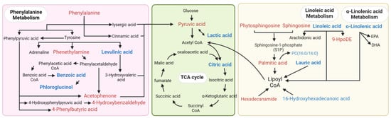 The pathway mapping of the differentially abundant metabolites. The pink area represents phenylalanine metabolism, the green area represents energy metabolism, and the yellow area represents lipid metabolism. Red color indicates the upregulation of DEMs, blue color indicates the downregulation of DEMs, and black metabolites are other important metabolites involved in the pathway.