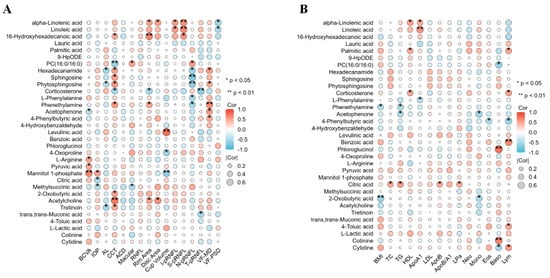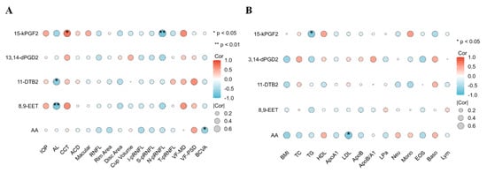 The correlation analysis of oxylipins with clinical and biochemical parameters. Correlation analysis between oxylipins and clinical (A) and biochemical (B) parameters.