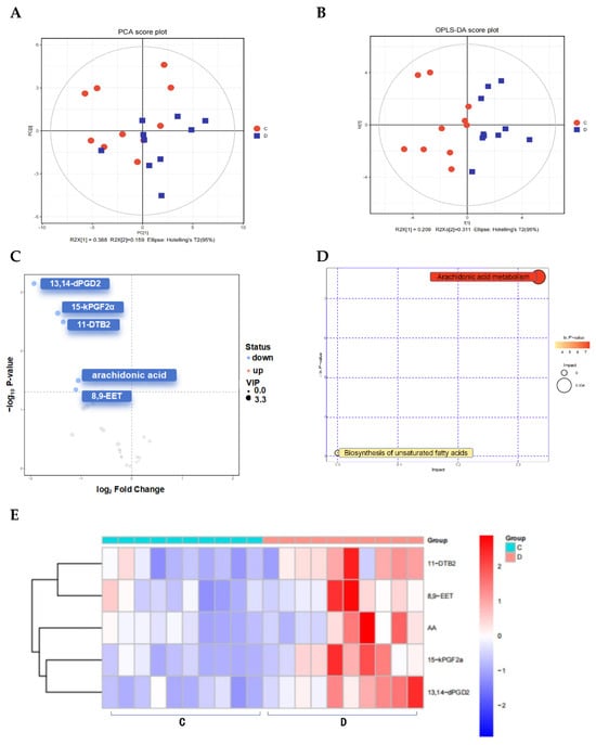 The processes for the preparation of samples, the analysis of extracts, the identification of metabolites, and the quantification were carried out in Sensichip Biotechnology Co., Ltd. (Shanghai, China), following their standard procedures—the metabolomics analysis performed on LC–MS (Thermo, Ultimate 3000LC, Q Exactive) platform. The ACQUITY UPLC HSS T3 column (100 mm × 2.1 mm, 1.8 μm) (Waters, Milford, MA, USA) was utilized for the chromatographic separation, employing a binary solvent system (solvent A: 0.05% formic acid in water; solvent B: acetonitrile). The gradient elution procedures were 0–1 min, 95% A; 1–12 min, 95% A; 12–13.5 min, 5% A; 13.5–13.6 min, 95% A; and 13.6–16 min, held at 95% A. The column temperature was kept at 40 °C, with a flow rate of 0.3 mL/min and an injection volume of 5 μL. The full-scan mode (m/z ranges 70–1050) with data-dependent secondary mass spectrometry scanning (TopN = 10) was utilized. Mass spectrometry was operated in both positive and negative ion modes. The mass spectrometry parameters included heater temperature 300 °C (+) and 300 °C (−); sheath gas flow rate 45 arb (+) and 45 arb (−); aux gas flow rate 15 arb (+) and 15 arb (−); sweep gas flow rate 1 arb (+) and 1 arb (−); spray voltage 3000 V (+) and 3200 V (−); capillary temperature 350 °C (+) and 350 °C (−); and S-Lens RF level 30% (+) and 60% (−). The compounds were identified by comparing their retention time with authentic standards, accurate mass, and fragmentation patterns based on the database (http://metlin.scripps.edu, accessed on 29 September 2022).