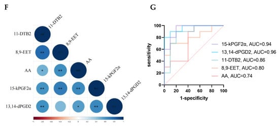 Oxylipin-targeted metabolomics analysis (OTMs). (A) PCA score plots and (B) OPLS-DA score plots of the two groups. (C) The volcano plot represents the screening of oxylipins. (D) Bubble plots indicate enrichment pathways. (E) Heatmap of oxylipins in the plasma between POAG and control. (F) Correlation heatmap of oxylipins, * p-value is less than 0.05, ** p-value is less than 0.01. (G) ROC curve analysis of oxylipins.