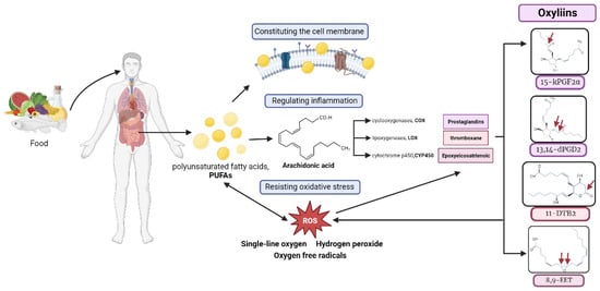 PUFAs, which are exclusively acquired via the diet, play a pivotal role in forming cellular membranes and modulating inflammatory and antioxidant responses. Reactive oxygen species (ROS) can oxidize PUFAs and AA to produce oxylipins. The resultant oxylipins exacerbate oxidative stress, underlining their potential impact on cellular homeostasis. Red arrows represent each oxylipin oxidized site.