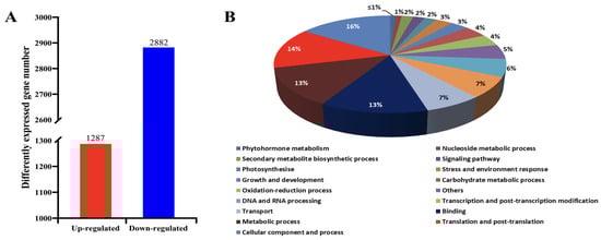 Using the Illumina platform, the strand-specific transcriptome libraries of healthy (HL) and phytoplasma-infected mulberry leaves (IL) were sequenced, and a total of 36.0 and 37.5 million clean reads were obtained in the HL and IL libraries, respectively. After calculating the expression level (FPKM) of each gene, a total of 4169 genes were found to be differentially expressed between HL and IL libraries, among which 1287 genes were up-regulated and 2882 genes were down-regulated in the IL libraries (Figure 1A). All of the differentially expressed genes (DEGs) detected are shown in Supplementary Table S1.
