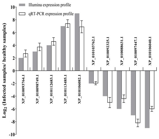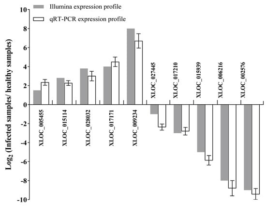 In order to confirm the reliability of the expression patterns of the lncRNAs obtained, the expression levels of 10 randomly selected lncRNAs were analyzed by qRT−PCR. The results showed consistent results between RNA-seq and qRT−PCR data (Figure 4), suggesting that the expression patterns of lncRNAs obtained are highly reliable, and the DE lncRNAs selected may play major roles in response to phytoplasma infection in mulberry.
