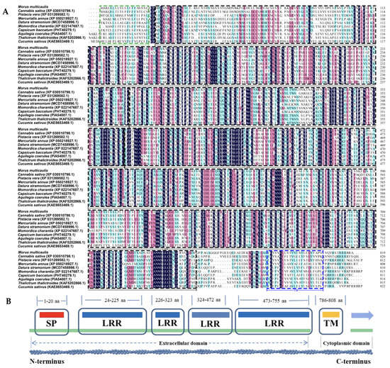 Our data showed that the expression level of lncNAT XLOC_027445 (LRR-RLK-AS) was decreased, while the expression level of its trans-target gene, the putative LRR receptor-like serine/threonine-protein kinase gene (LRR-RLK), was increased in the phytoplasma-infected leaves, and these results were confirmed by qRT-PCR (Figure 2 and Figure 4). As we have seen, the LRR-RLK gene has not been reported to be associated with phytoplasma infection, and the gene in mulberry has not been characterized. To explore the roles of the LRR-RLK and LRR-RLK-AS in the response to phytoplasma infection in mulberry, the LRR-RLK gene was cloned from mulberry (M. multicaulis Perr.) and designated as MuLRR-RLK. The MuLRR-RLK gene encodes a protein of 819 amino acid residues, with a predicted molecular weight of 89.923 kDa and a pI of 5.98. Multiple sequence alignment analysis showed that the amino acids of MuLRR-RLK protein have high sequence identity with other plant LRR-RLK proteins, indicating that MuLRR-RLK is an evolutionarily conserved protein (Figure 5A). Protein structure analysis showed that MuLRR-RLK has structural characteristics of the LRR-RLK protein family, including a signaling peptide (SP) (1–20aa), four leucine-rich repeats (LRR) (112–173aa; 210–269aa; 520–577aa; 658–716aa) at the N-terminus, a transmembrane (TM) domain (784–809aa), and an intracellular Ser/Thr kinase domain (KD) at the C-terminus (Figure 5B).