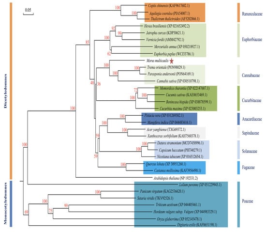 Phylogenetic analyses of MuLRR-RLK proteins from different plants. The phylogenetic tree was generalized using the neighbor-joining method. The numbers on the nodes are bootstrap values, and the scale indicates genetic distance. GenBank accession numbers of the proteins are shown in brackets. Red star indicates MuLRR-RLK protein.