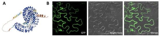 Predicted three-dimensional structure (A) and subcellular localization of MuLRR-RLK (B). MuLRR-RLK-GFP fusion protein was transiently expressed in Nicotiana benthamiana leaf epidermal cells and visualized with a confocal laser scanning microscope (Zeiss LSM880, Zeiss, Jena, Germany). The left image shows the cell with a GFP signal, and the bright-field view of the same cells is shown in the middle image. The right image indicates the overlays of the fluorescent and bright-field images.