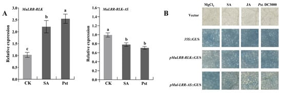 Induced expression profiles of MuLRR-RLK and MuLRR-RLK-AS. (A) Expression profiles of MuLRR-RLK and MuLRR-RLK-AS in mulberry leaves induced by Pst. DC3000 or SA. EF1-α was chosen as a reference gene for the qRT−PCR analysis, data represent the mean values of three biological replicates ± standard deviation, and different letters above the columns indicate significant differences at the 5% level according to the Duncan’s multiple range tests. Different letters indicate significant differences at p < 0.05 (Duncan’s multiple range test) (B) Transient expression of the GUS gene controlled by pMuLRR-RLK and pMuLRR-RLK-AS in N. benthamiana leaves, respectively. Tobacco leaves that were infiltrated were sampled at 6 h after SA treatments and at 36 h after Pst. DC3000 inoculation, respectively. Pst indicates Pst. DC3000.