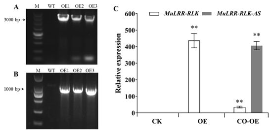 Expression levels of MuLRR-RLK in the transgenic Arabidopsis plants overexpressing MuLRR-RLK and co-expressing MuLRR-RLK and MuLRR-RLK-AS. (A,B) Genome PCR analysis showing that the MuLRR-RLK and MuLRR-RLK-AS genes were integrated into the genomes of transgenic Arabidopsis plants. (C) Expression levels of MuLRR-RLK in the transgenic Arabidopsis plants overexpressing MuLRR-RLK and co-expressing MuLRR-RLK and MuLRR-RLK-AS. The gene expression levels were evaluated via the ΔCt method with the EF1-α gene as a reference gene. Assays were performed three times with three replicates each time. Values are given as the mean ± SD of three experiments in each group. The double asterisks indicate significant differences at p < 0.05. CK indicates the transgenic empty vector plant. OE indicates the transgenic MuLRR-RLK plant. CO-OE indicates the co-expressing MuLRR-RLK and MuLRR-RLK-AS Arabidopsis plant.