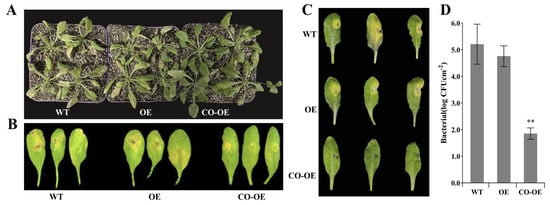 Because an efficient regeneration system has not yet been established in mulberry, it is difficult to obtain transgenic mulberry trees. The nucleotide sequence identity of MuLRR-RLK and its homologue in Arabidopsis was low (74.6%). To verify the suppression of MuLRR-RLK-AS on the expression of MuLRR-RLK, the expression vector of MuLRR-RLK and the vector co-expressing MuLRR-RLK and MuLRR-RLK-AS were constructed, respectively, and transgenic Arabidopsis plants overexpressing MuLRR-RLK (OE) or co-expressing MuLRR-RLK and MuLRR-RLK-AS (CO-OE) were generated. The results of genome PCR analysis showed that both MuLRR-RLK and MuLRR-RLK-AS genes were integrated into the Arabidopsis genome (Figure 9A,B). Moreover, qRT−PCR analysis results indicated that the MuLRR-RLK gene was successfully expressed in the OE plants, and the expression levels of MuLRR-RLK were significantly higher in the OE Arabidopsis than those in the WT plants (Figure 9C). Although the expression levels of MuLRR-RLK-AS were significantly higher in the CO-OE plants than those in the WT plants, the expression level of MuLRR-RLK was significantly lower than that in the OE plants. This confirmed that the expression of MuLRR-RLK-AS effectively represses the expression of MuLRR-RLK.