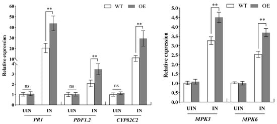 Regulation of MuLRR-RLK in the expression of defense-related genes, MPK3, and MPK6. With EF1-α as a reference gene, the gene expression levels were detected by qRT-qPCR using the comparative Ct method. The experiment was conducted three times, repeated three times each time, and the values in the bar graphs are the mean ± SD of three experiments. The double asterisk above the bar indicates significant difference at p < 0.05 according to Student’s t-test, and ns above the bar indicates no significant difference (p > 0.05). WT: Wild-ype Arabidopsis seedlings. OE: Transgenic MuLRR-RLK Arabidopsis seedlings. IN and UIN indicate the plants with or without pathogen inoculation, respectively.