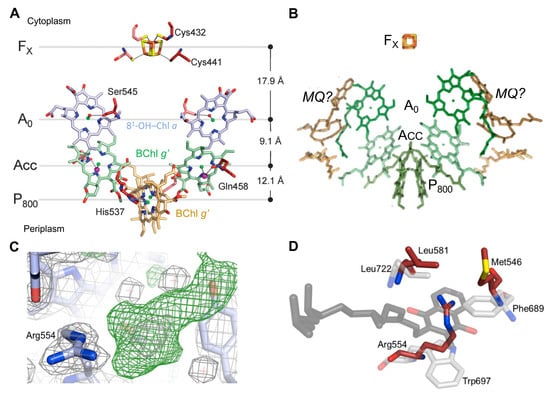 The C2 symmetry axis, as assumed by the GSB RC cofactors, is shown in Figure 3D, together with the coordinating residues provided by the homodimeric (PscA)2 protein [5]. The essentially identical distances between the cofactors of each branch suggest that electron flow occurs on both sides. Note that the distances between A0 and FX of 18.1 and 18.2 Å [4] (reported as ~17.5 and 17.6 Å in [5]), which are shorter than the ~23 Å observed in PSI [7] and similar to the 17.9 Å for the HB RC [3]. Thus, the A0 and FX components of the GSB RCs are also sufficiently close to promote the observed slowed electron transfer rate [31]. While a PQ molecule intervenes in sustaining electron transfer between A0 and FX in PSI, and an inserted MQ was shown to play such a role in the HB RC under high-light intensity conditions [21], only trace levels of Q were found in the GSB core RC-PS complex [5]. Moreover, it was not possible to model an MQ into an appropriate binding site in the GSB complex, and therefore, general agreement exists that electrons are transferred directly from A0 and FX (see, however, [32,33,34]).
