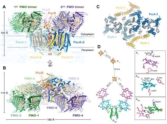 The green sulfur bacterium Chlorobaculum tepidum, like Hmi. modesticaldum, is a thermophilic obligate anaerobe that also contains a Type I homodimeric RC with the RC protein (PscA)2 as a core. The LH capabilities of Cba. tepidum is considerably enhanced by a chlorosome peripheral antenna system containing self-assembled Chl c molecules that exist as a lamellar structure lacking a protein scaffold [26]. The chlorosomes are connected by a baseplate to two copies of the trimeric FMO, in which each protomer contains eight BChls a, from which excitons are passed onto the RC-core of the RC-PS complex. While energy transfer efficiencies between the Chls c within chlorosomes to the FMO BChls a and within FMO approach the 100% levels found for transfer from LH Chls to the PSI RC, the efficiencies in the GSB range from only 35 to 75% for the FMO trimer to the RC-PS [27,28,29,30]. In an effort to elucidate the basis for the reduction in energy transfer efficiency and to obtain an improved understanding of the overall excitation energy and electron transfer pathways, a complete 2.5 Å cryo-electron microscopy (EM) structure of the FMO-containing Cba. tepidum RC-PS was recently determined by Xie et al. [4] (Figure 3A,B). This was accomplished with a complex purified after solubilization with n-dodecly-β-D-maltoside and detergent exchange to lauryl maltoside neopentylglycol; the resulting structural model follows an earlier 2.7 Å cryo-EM structure [5] which lacked both the cytochromes cZ (PscC-1 and PscC-2) and the second FMO trimer subunits.