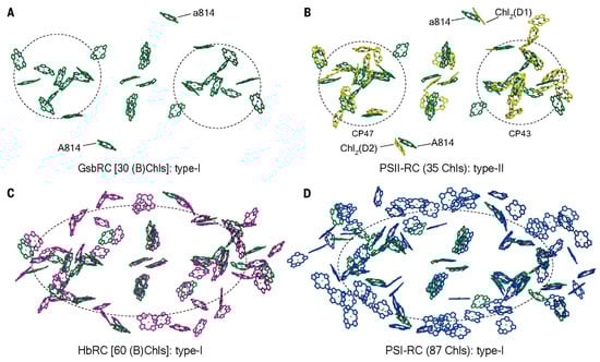 Figure 4. The common arrangement of (B)Chls in Type I and II RC complexes. (A,B) Distributions and superpositioning of (B)Chls in the green sulfur bacterial (GSB) RC-PS complex (dark green) and in PSII (yellow) shown perpendicular to the membrane plane [5]. Dashed circles demarcate similar clustering of the antenna (B)Chls around the RC electron transferring cofactors. (C,D) Distributions and superpositioning of (B)Chls in GSB RC-PS (dark green) with those of the HB RC-PS (purple) and PSI (blue). Dashed ellipses demarcate the closed rings of (B)Chls distributed across the two RC-PS subunits. Note that the (B)Chl distribution in the GSB RC-PS more closely resembles that of PSII than PSI.
