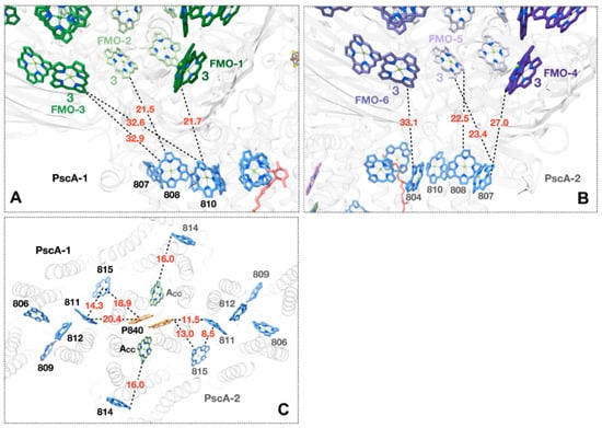 Figure 5. Potential pathways of excitation energy transfer revealed by the structure of the GSB FMO-RC-PS complex [4]. (A) Interface region between FMO-1 and PscA-1 subunit at cytoplasmic pigment surface. Interpigment distances (Å) represent BChl edge-to-edge distances. (B) Interface region between FMO-4 and PscA-2 subunit showing BChl edge-to-edge distances. (C) Potential pathways of energy transfer from nearby light harvesting (LH)-BChls to P840 special pair located in the periplasmic bilayer. BChl edge-to-edge distances are shown for PsaA-2-associated BChls, while their Mg-to-Mg distances are shown for their PsaA-1-associated counterparts. Phytyl tails of (B)Chls have been removed for clarity.
