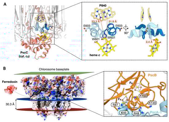 Figure 6. (A) Potential Cba. tepidum cytochrome cZ binding site as predicted from protein–protein docking analysis [4], using the crystal structure of the C-terminal electron carrier domain [41] with enlarged view at right. Red dotted lines in the right panel show respective distances from the heme Fe to the Mg ions of each of the P840 special pair BChls. At right, the distance between the heme-associated propionate group and the neighboring PscA Trp601 residues is also shown. (B) Potential ferredoxin-PscB binding site [4], shown in the electrostatic surface representation of the Cab. tepidum FMO-RC-PS. Protein surface coloring represents the electrostatic surface potential (−10 kT, red; +10 kT, blue). An enlarged detailed view of the putative ferredoxin-PscB docking site is seen at right, along with a number of adjacent positively charged residues provided by both PscA-1 and PscB.