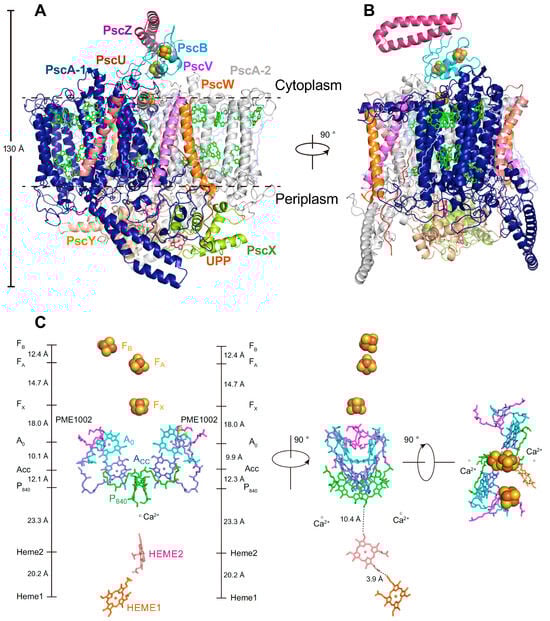 The structure of the Type I RC-PS of Cac. thermophilum, recently determined at 2.6 Å resolution by cryo-EM [6], is shown in Figure 7A,B. Besides the homodimeric PscA-1 and PscA-2 subunits, eight additional subunits were identified, which included PscB, housing the terminal [4Fe-4S] cluster electron acceptors FA and FB, accompanied by PscZ, with an apparent PscB stabilizing role (Table 1). Also included were the distinct membrane-associated monoheme cytochrome c subunits PscX and PscY, forming a heterodimer in which their respective hemes c 1 and 2 are located within deep protein grooves where they serve as the secondary and primary electron donors to the RC P840 special pair. In addition, low mol. wt. subunits Psc U, PscV, PscW, and UPP of unknown function were also identified. However, the FMO antenna was lost during purification, and its structure was not determined along with the Cac. thermophilum RC-PS.