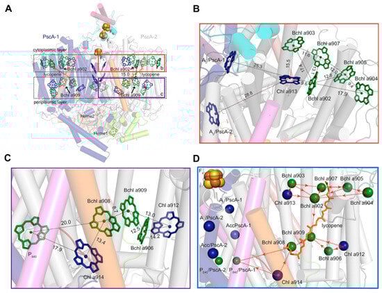 The LH-(B)Chl a content consisting of 6 LH-Chls a and 16 LH-BChls a provides the Cab. themophilum RC-PS with the ability to harvest both visible and far-red light, giving rise to an excitonically coupled “hybrid” LH system [6]. The boxes in Figure 8A demarcate pigment distribution in the cytoplasmic and periplasmic bilayer leaflets, with the PscA-2 cytoplasmic leaflet harboring one Chl a (913) and five Bchls a (902, 903, 904, 905, and 907) (Figure 8B), while two Chls a (912 and 914) together with three BChls a (906, 908, and 909) are found in the corresponding periplasmic leaflet (Figure 8C). The Mg2+-to-Mg2+ distance of 15.0 Å between BChl a902 and BChl a909 represents the closest inter-bilayer connection and serves as a common energy transfer locus for the distinct hybrid pigment arrays (Figure 8A–D) [6]. Based upon the Mg2+-to-Mg2+ distances between BChl a902 and the cytoplasmic array of BChls a ranging from 12.8 to 17.9 Å and 9.6 Å to Chl a913 (Figure 8B), a pathway of energy transfer was posited between these pigments that culminate at BChl a909 within the periplasmic layer (Figure 8D). Once the energy reaches BChl a908, the transfer occurs directly to P840, representing the PscA-1 half of the Zn-BChl a’ special pair, but it is also expected to occur simultaneously from Chl a914 (Figure 8C), thereby completing this efficient excitation energy scheme within the bilayer leaflets.