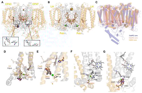 Figure 9. Structural evidence supporting the role of the Ca2+-binding site of the HB RC as a possible evolutionary precursor of the PSII H2O oxidizing Mn4CaO5 cluster region [2]. (A) PSII RC heterodimeric D1 and D2 RC core polypeptides (gray structures); Chl protein (CP)43 and CP47 antenna proteins (orange structures); cofactors are shown as stick structures. Boxed regions show an enhanced view of homology between the D1 YZ donor site and YD of the D2 polypeptide (B). The HB (PshA)2 homodimeric antenna (orange structures comprising α-helices 1–6) and RC core regions (gray structure comprising α-helices 7–11). Spheres in panels A and B represent Fe (orange), S (yellow), Mn (purple), O (red), and Ca (green) atoms. (C) Superpositioning of homodimeric Type I RC Ca2+-binding sites within RC-PS structures [6]. (D) Enhanced view of conserved regions of TMH 3 and 4 of D1 polypeptide (orange) and helices 9 and 10 of the PshA RC domain (gray). (E) Enhanced view of matching regions of PsaB of cyanobacterial PSI RC (orange) and PshA RC (gray), demonstrating that helix 11 is two turns greater in length than PshA counterpart (as demarcated by the black and red arrowheads), as well as the lack of Ca2+ binding site in PSI [2]. (F) Enhanced view of PshA Ca2+-binding site illustrating the connection of ligand of Asn263 of the antenna domain of the PshA protein. (G) Enhanced view of the Mn4CaO5 cluster and YZ regions of PSII illustrating how the C-terminal residues Glu354 of CP43 and Ala344 of D1 provide direct ligands to the Ca2+ atom within the Mn4CaO5 cluster.