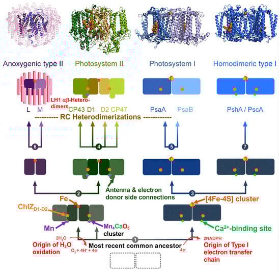 Figure 10. Overview of evolutionary steps leading to the extant Type I and I RCs (adapted from [2]). Step 1 is based upon sequence analyses and structural and functional changes initiated in the common ancestor containing both the Type II and Type I RC precursors. In steps 2 and 3, evolutionary precursors are further separated into distinct RC-PS precursors, ultimately forming the distinct monophyletic Type II and Type I RC clades. Subsequent heterodimerization occurs in steps 4, 5, and 6 to create the respective extant PSII, PSI, and anoxygenic Type II RCs, and then later acquiring the elliptical heterodimeric LH1 antenna, while PSII obtains the CP43 antenna on the D1 side and the CP47 antenna on the D2 side. The arrangement of antenna (B)Chls in PSI and in the homodimeric HB Type II RC-PS is likely to have already been established in their immediate homodimeric precursors. Notably, PSII shares more characteristics with homodimeric Type I RCs than with Type II anoxygenic counterparts, as detailed in the text. The structures shown at the top consist of RC-LH1 complex from Thermochromatium tepidum (3.0 Å resolution, Protein Data Bank (PDB) ID: 3WMM), PSII of Thermosynechococcus vulcanus (1.9 Å resolution, PDB ID: 3WU2), PSI of Synecho-coccus elongatus (2.5 Å resolution, PDB ID: 1JB0), Type I homodimeric RC-PS of Hmi. modesticaldum (2.2 Å resolution, PDB ID: 5V8K).