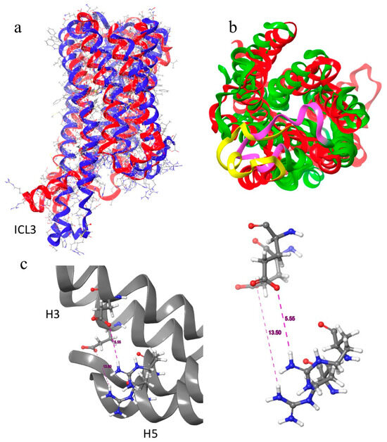 Overlay of two structures of Aedae-ACPR: (a) Side view, red = active state (6kr8); blue = inactive state (5D5A); (b) Top view highlighting the different positions of ECL2, yellow = inactive state; purple = active state; and (c) Ionic lock, distance between Glu299 and Arg205. Inactive (5D5A) 5.56 Å, active (6kr8) 13.5 A. Note how H3 and H5 have moved away from each other upon activation.