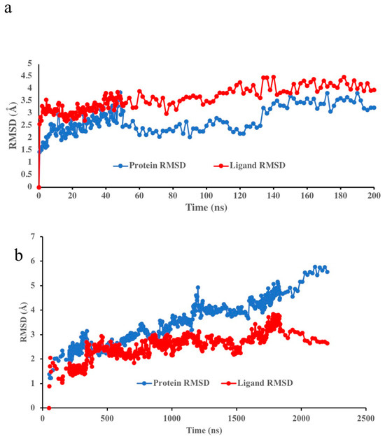 Protein RMSD during MD simulation of Aedae-ACP bound to Aedae-ACPR: (a) 6kr8 model; and (b) 5D5A model.