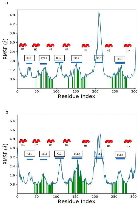 The RMSF of the Cα atoms of the active receptor model is shown in Figure 6a. Apart from ICL3, which fluctuates 4.8 Å, there is very little change in the conformation of the receptors. The conformation of the trans-membrane helices remains fairly rigid. Protein residues that interact with the ligand are shown as vertical green lines. Aedae-ACP interacts with ECL1 and the adjacent residues of H2 and H3. Another two regions of ligand/protein contact are ECL2, H5, H6, and ECL3. The RMSF profile of Aedae-ACPR is similar to those found for several AKH insect receptor models [40].